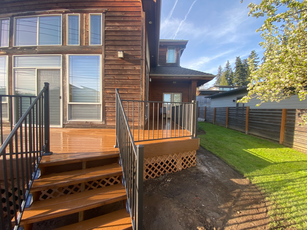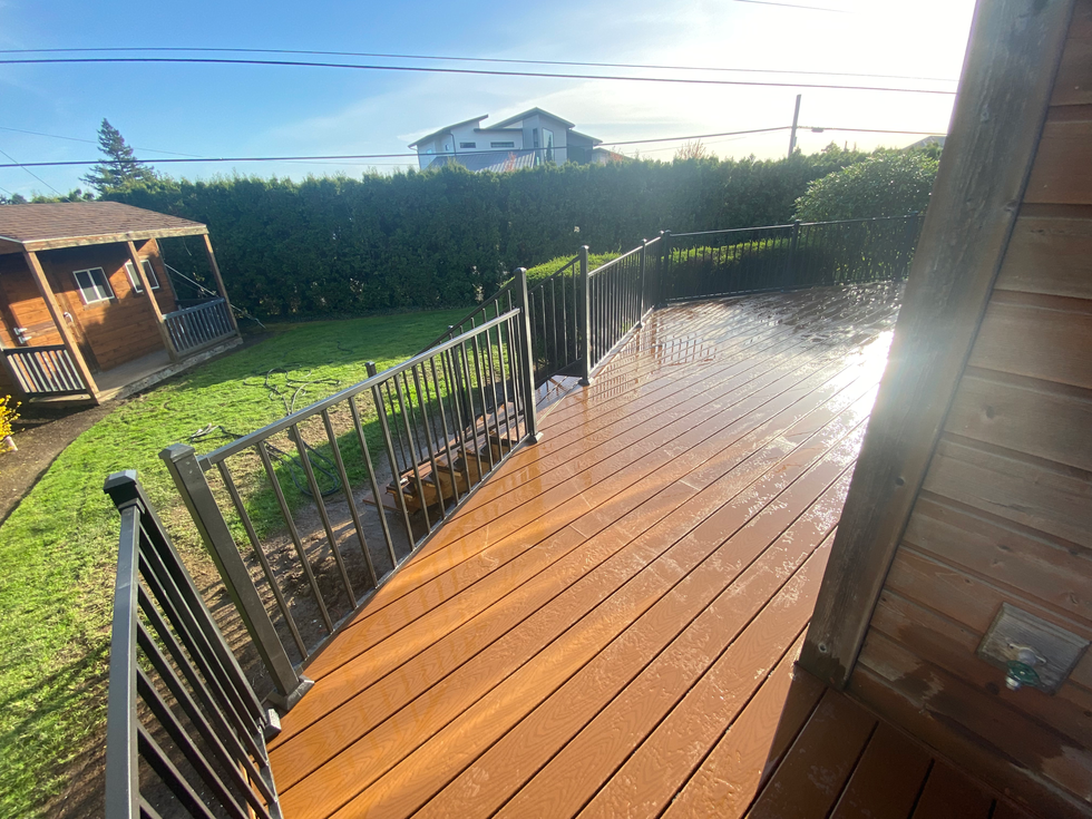 A series of images highlighting the process of constructing and designing decks for residential properties, featuring various styles and materials.
